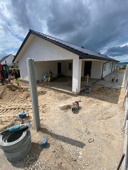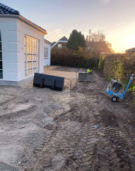 Udgravning og etablering af have. Her har vi lavet belægning, trapper, lagt rullegræs, samt sat hæk.